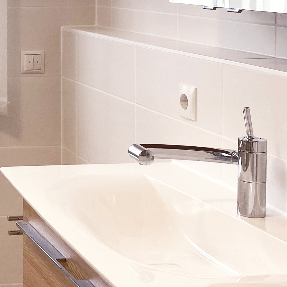 Die Innenausstattung des Hauses ist in hellen Farben gestaltet. Die Böden der Wohnräume sind mit geöltem Eichenparkett ausgelegt, das für ein besonderes Wohnklima sorgt und das Barfußgehen angenehm macht. Die Wohnräume sind hoch (2,60 m), groß und lichtdurchflutet.
